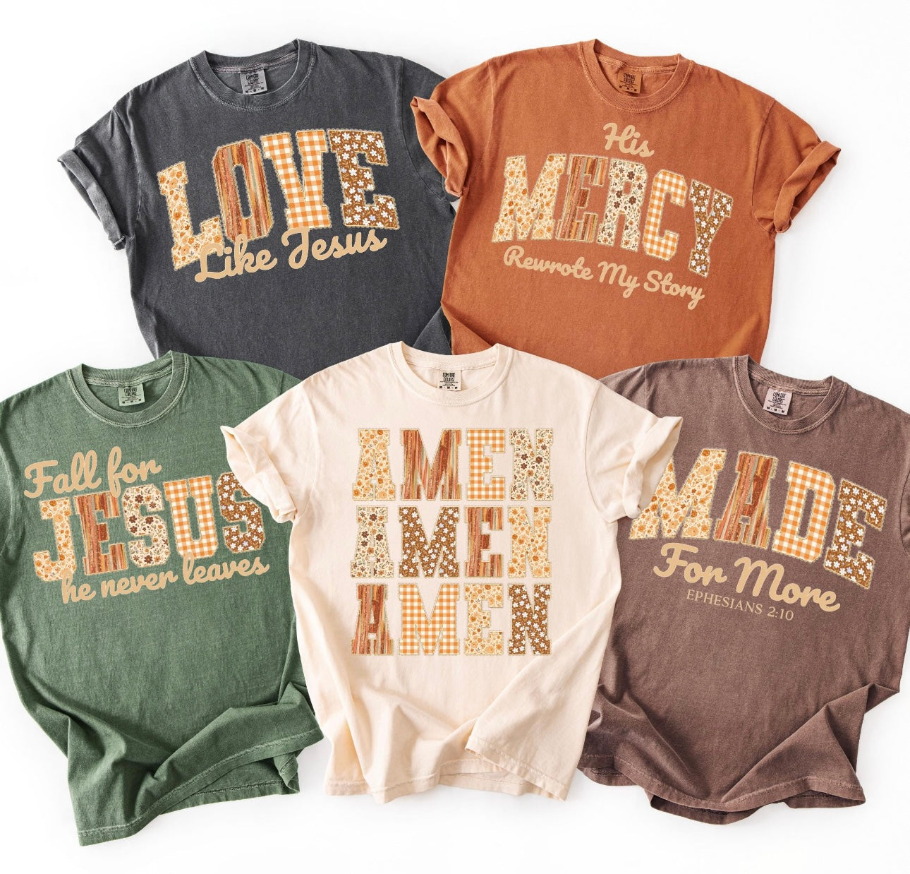 Colors pictured are comfort colors “pepper, yam, moss, ivory, espresso”